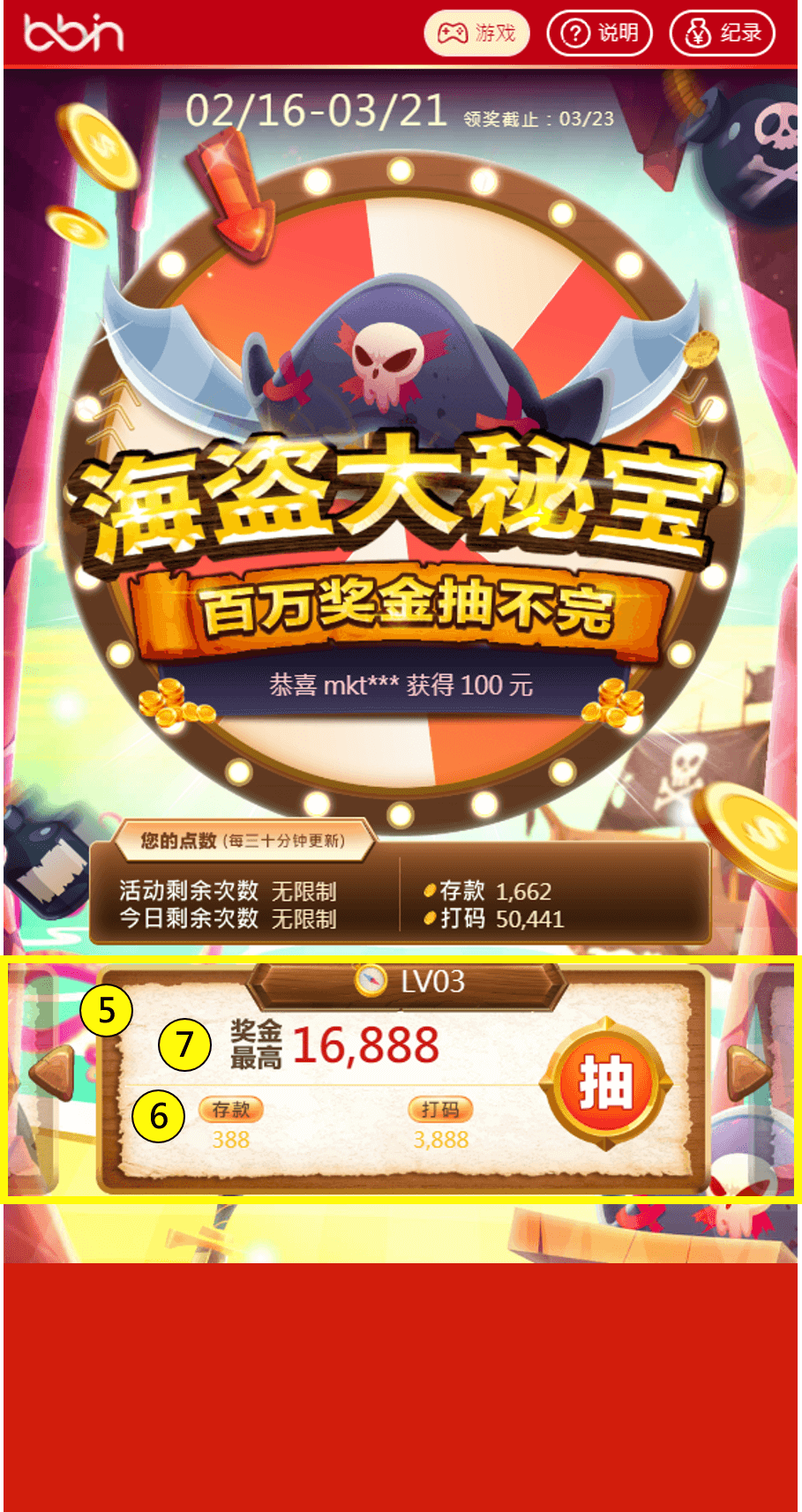 领完后打码点数剩下 5,000-500=4,500 ,会员再次领奖仍只能领门槛4的奖金